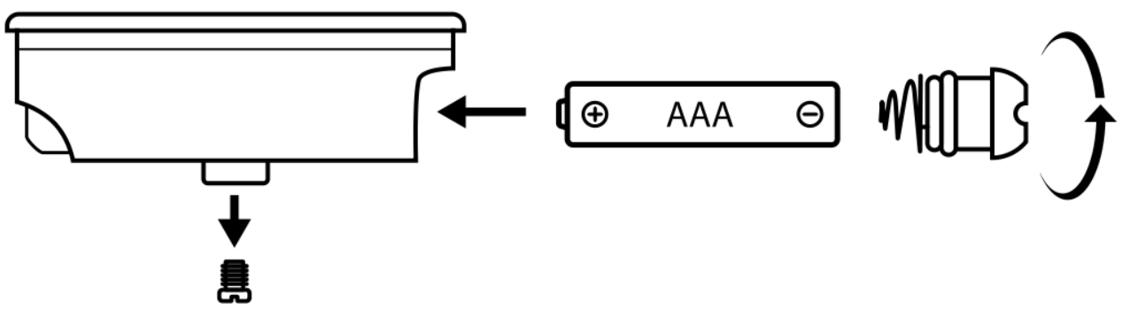 Battery installation: Unscrew and remove the battery cover and bottom screw from the Smart Capsule. Insert (1) AAA battery so that the positive (+) end goes in first. Replace the battery cover and screw back in. Do not overtighten.