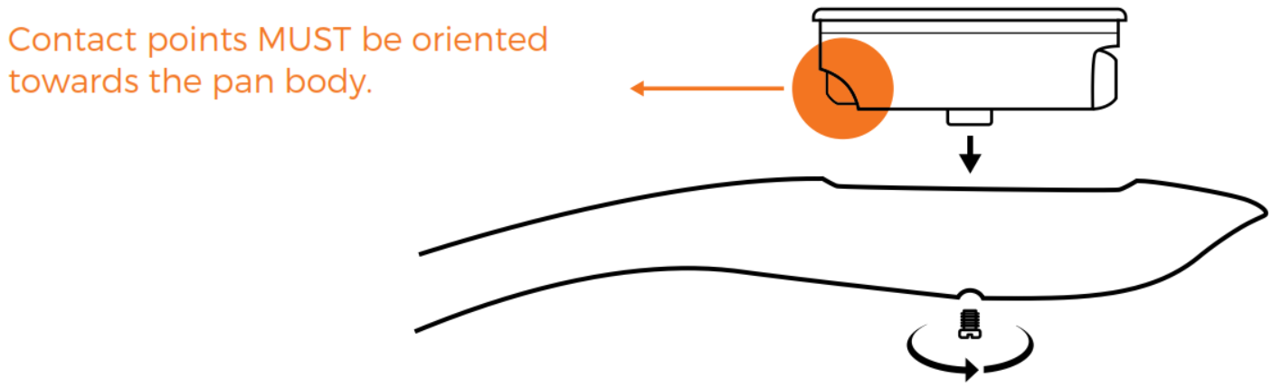 Capsule installation: After correctly installing the battery, completely insert the Smart Capsule into a Hestan Cue cookware handle. Make sure the metal pins on the capsule make contact with the pins inside the handle. Tighten screw located on the underside of cookware handle. Do not overtighten. Failure to install the screw completely may result in the capsule becoming dislodged.